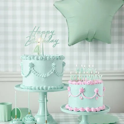€4.35| /Acrylic cake topper ''Happy Birthday'' in matte green color, height approx. 16.5 cm, width about 18 cm.
