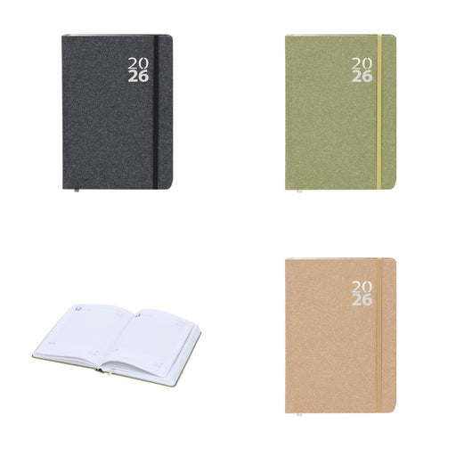 B5 ring-bound diary made of soft RPET polyester. With rigid covers and matching elastic closure. Includes a kraft presentation box. Features RPET l...