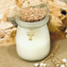 Eye catching candle inside a matt glass jar with a gold cross charm with gold cord and cork lid.