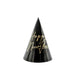Party hats Happy New Year made of paper in black colour with gold metallic print, mix of designs. Height approx. 16 cm, diameter approx. 10 cm.