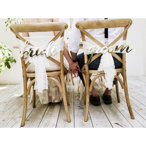 €6.85| /Chair signs Bride and Groom, Elegant Bliss, gold, sizes approx. 35 x 17 cm and approx. 37 x 17 cm.(1 pkt / 2 pc.)