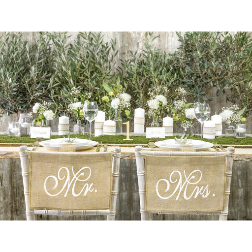€5.50| /Chair signs made of burlap, with white inscriptions Mr and Mrs, size approx. 30 x 21.5 cm.(1 pkt / 2 pc.)